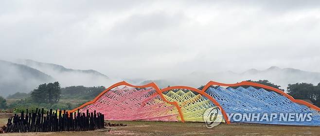 (홍천=연합뉴스) 이상학 기자 = 국내 첫 노마딕 시각예술축제인 '강원국제트리엔날레 2021'의 오픈을 하루 앞둔 29일 전시를 위한 모든 준비가 마무리됐다. 사진은 4곳의 전시장 중 한곳인 홍천 옛 와동분교 내 설치된 작품 모습이다. 2021.9.29