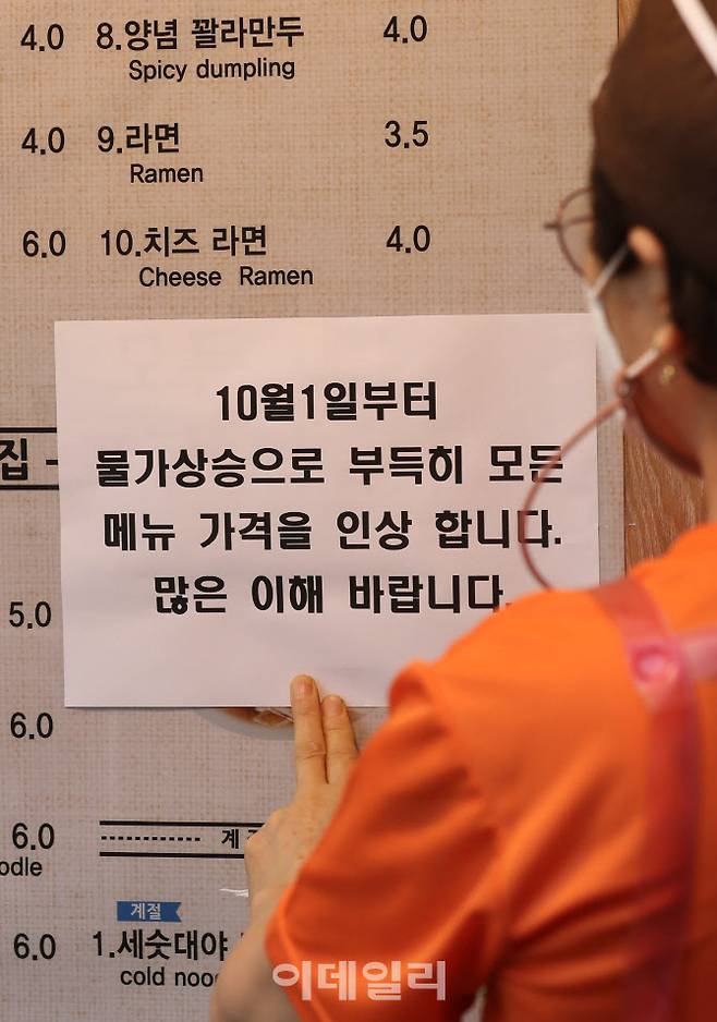 [이데일리 노진환 기자] 식료품과 원자재 가격 급등, 인건비와 물류비 등의 증가 등 물가상승의 영향으로 장바구니 물가에 비상이 걸린 가운데 29일 오후 서울 마포구 공덕동의 한 식당에서 직원이 다음달 1일부터 메뉴 가격 인상을 알리는 안내문을 붙이고 있다.