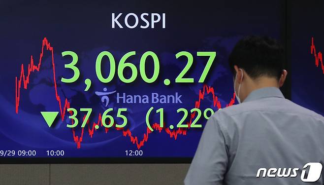 (서울=뉴스1) 송원영 기자 = 29일 오후 서울 중구 하나은행 딜링룸 전광판에 코스피 지수가 전 거래일보다 37.65 포인트(1.22%) 하락한 3060.27을 나타내고 있다. 이날 코스닥 지수는 전일 대비 11.05포인트(1.09%) 내린 1001.46으로 장을 마쳤다. 원달러 환율은 전날보다 2.6원 내린 1181.8원으로 거래를 마감했다. 2021.9.29/뉴스1
