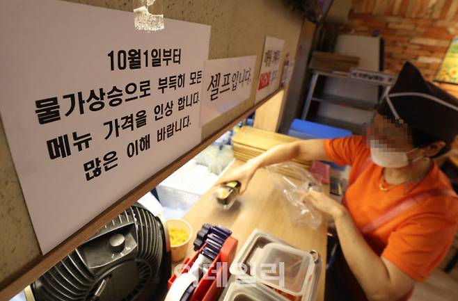 [이데일리 노진환 기자] 식료품과 원자재 가격 급등, 인건비와 물류비 등의 증가 등 물가상승의 영향으로 장바구니 물가에 비상이 걸린 가운데 29일 오후 서울 마포구 공덕동의 한 식당에 다음달 1일부터 메뉴 가격 인상을 알리는 안내문이 붙어 있다.