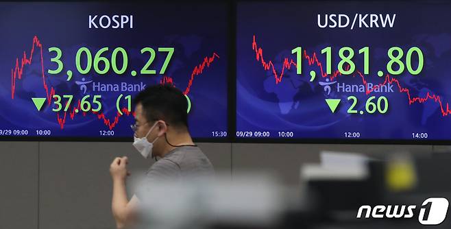 (서울=뉴스1) 송원영 기자 = 29일 오후 서울 중구 하나은행 딜링룸 전광판에 코스피 지수가 전 거래일보다 37.65 포인트(1.22%) 하락한 3060.27을 나타내고 있다. 이날 코스닥 지수는 전일 대비 11.05포인트(1.09%) 내린 1001.46으로 장을 마쳤다. 원달러 환율은 전날보다 2.6원 내린 1181.8원으로 거래를 마감했다. 2021.9.29/뉴스1