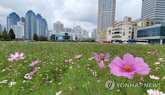 (부산=연합뉴스) 조정호 기자 = 29일 부산 남구 문현금융단지에 주택금융공사가 조성한 꽃밭에서 활짝 핀 코스모스가 가을을 알리고 있다. 2021.9.29
