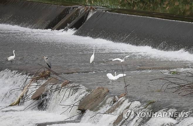 (전주=연합뉴스) 최영수 기자 = 29일 이슬비가 내리는 가운데 백로들이 전주시내 덕진천을 노닐고 있다. 2021.9.29