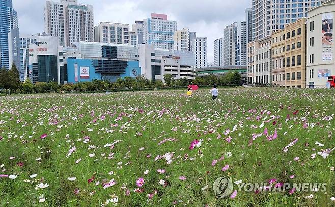 (부산=연합뉴스) 조정호 기자 = 29일 부산 남구 문현금융단지에 주택금융공사가 조성한 꽃밭에서 활짝 핀 코스모스가 가을을 알리고 있다. 2021.9.29