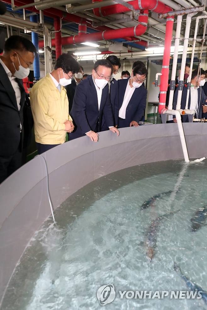 (강릉=연합뉴스) 김주형 기자 = 김부겸 국무총리가 29일 오후 강원 스마트양식 클러스터 조성 현장인 강원도 수산자원연구원을 방문해 대서양 연어 기술개발 현황을 보고받은 후 시설을 둘러보고 있다. 2021.9.29