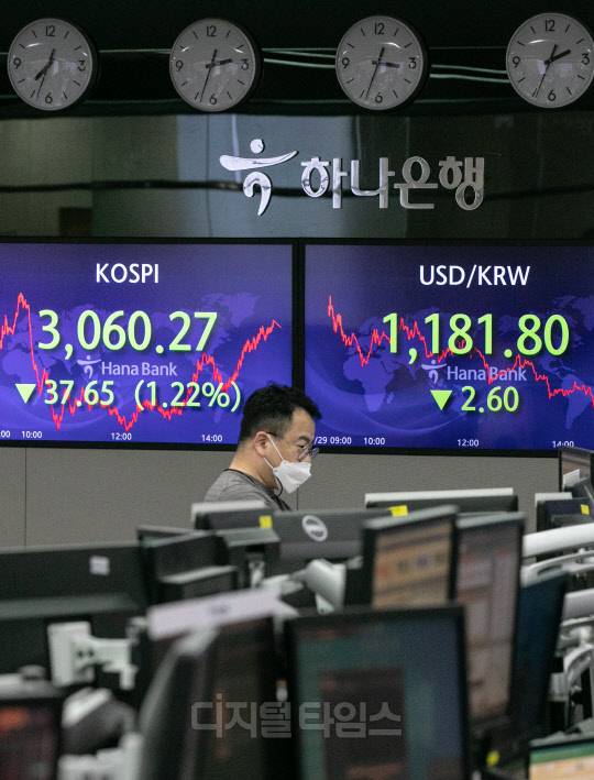 코스피가 전 거래일보다 37.65포인트 하락하며 장을 마친 29일 서울 중구 하나은행 딜링룸에서 직원들이 분주히 업무를 보고 있다. 코스닥은 11.05포인트 하락한 1001.46, 원·달러 환율은 2.6원 하락한 1181.8원으로 마감했다.