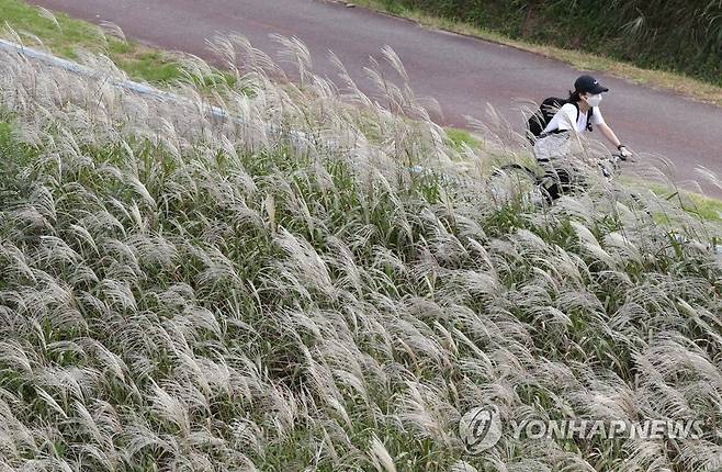 (울산=연합뉴스) 김용태 기자 = 29일 오후 울산 태화강변에서 자전거를 탄 시민이 은빛으로 물든 억새밭 사이를 지나가고 있다. 2021.9.29