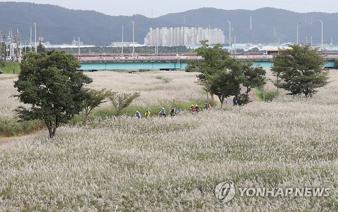 (울산=연합뉴스) 김용태 기자 = 29일 오후 울산 태화강변에서 자전거를 탄 시민들이 은빛으로 물든 억새밭 사이를 지나가고 있다. 2021.9.29