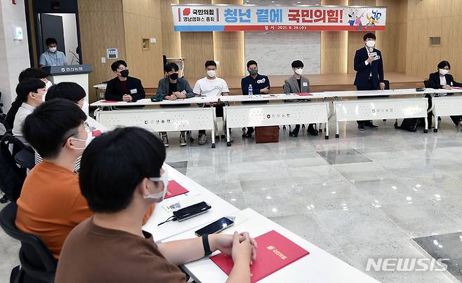 [경산=뉴시스] 이무열 기자 = 이준석 국민의힘 대표가 29일 오후 경북 경산시 경산농협 본점 대회의실에서 열린 국민의힘 영남캠퍼스 총회에 참석해 인사말을 하고 있다. 2021.09.29. lmy@newsis.com