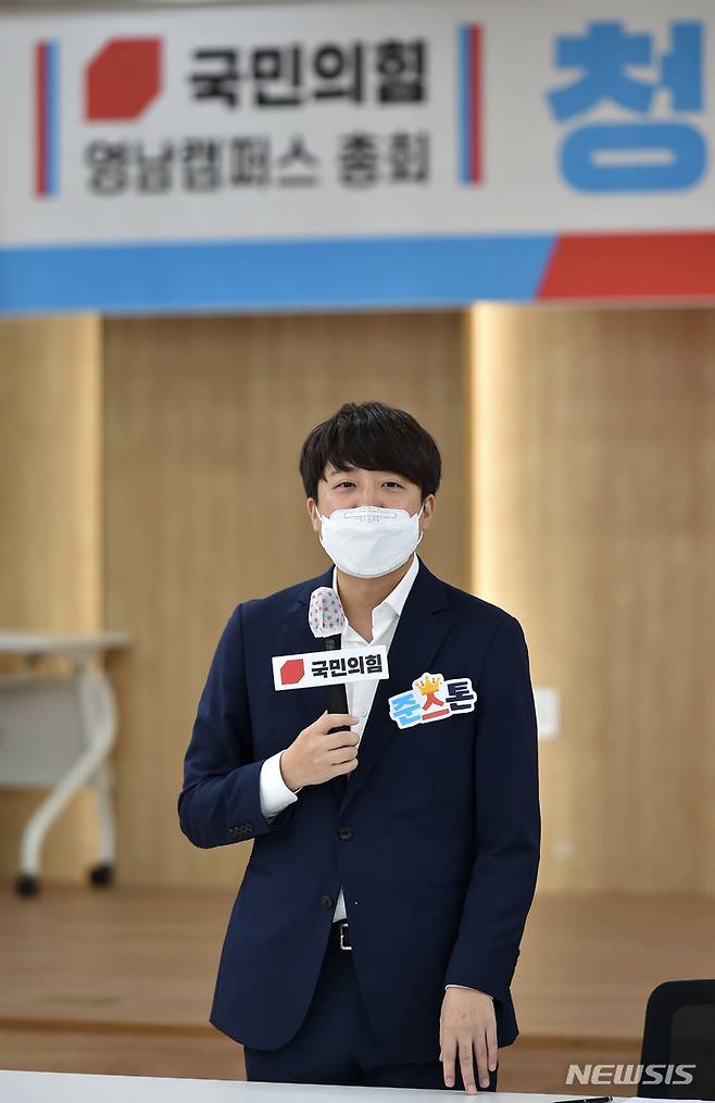 [경산=뉴시스] 이무열 기자 = 이준석 국민의힘 대표가 29일 오후 경북 경산시 경산농협 본점 대회의실에서 열린 국민의힘 영남캠퍼스 총회에 참석해 인사말을 하고 있다. 2021.09.29. lmy@newsis.com