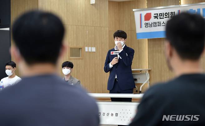 [경산=뉴시스] 이무열 기자 = 이준석 국민의힘 대표가 29일 오후 경북 경산시 경산농협 본점 대회의실에서 열린 국민의힘 영남캠퍼스 총회에 참석해 인사말을 하고 있다. 2021.09.29. lmy@newsis.com