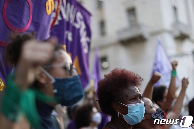 (상파울루 로이터=뉴스1) 금준혁 기자 = 28일(현지시간) 상파울루에서 여성들이 '안전하고 합법적인 임신중지를 위한 국제행동의 날'을 기념하기 위해 시위하고 있다. 중남미 국가에서 이 날을 기념하는 시위가 잇따르고 있다.