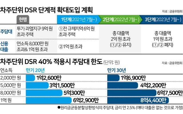 지난 7월부터 1단계 DSR 규제는 부동산 규제지역 내 6억 원 초과 주택을 구매할 때 주택담보대출(주담대), 1억 원 초과 신용대출에 대해 먼저 적용됐다. DSR 40% 대상은 이어 내년 7월(2단계), 2023년 7월(3단계)부터 주담대와 신용대출을 더한 총 대출액이 각각 2억 원, 1억 원을 웃도는 차주로 넓어진다.