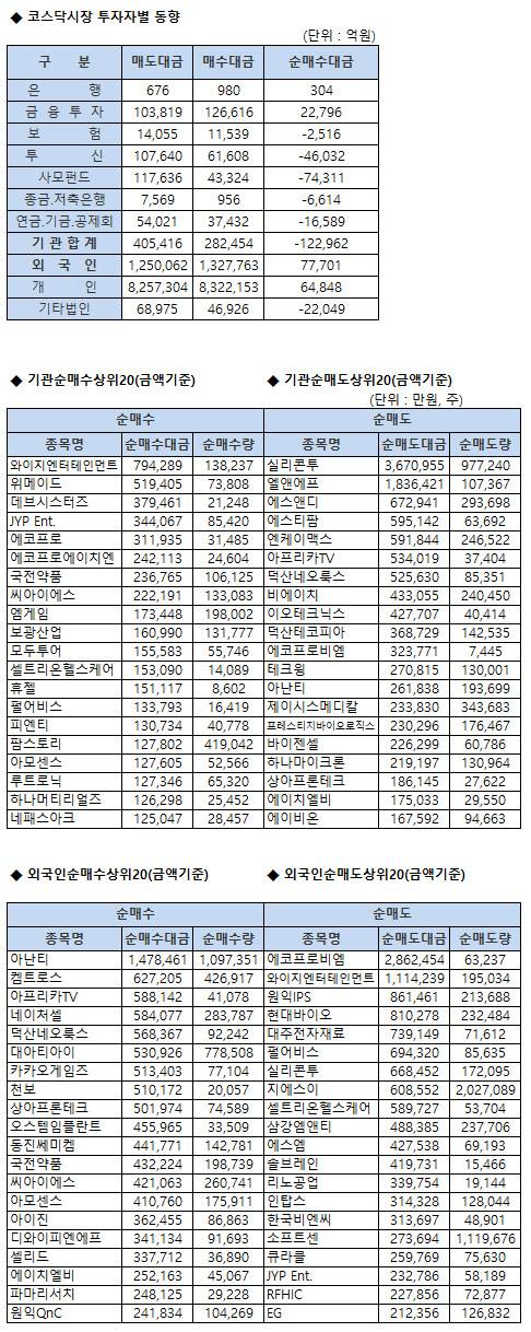 [표]코스닥 기관/외국인 매매동향(9/29 3시30분)