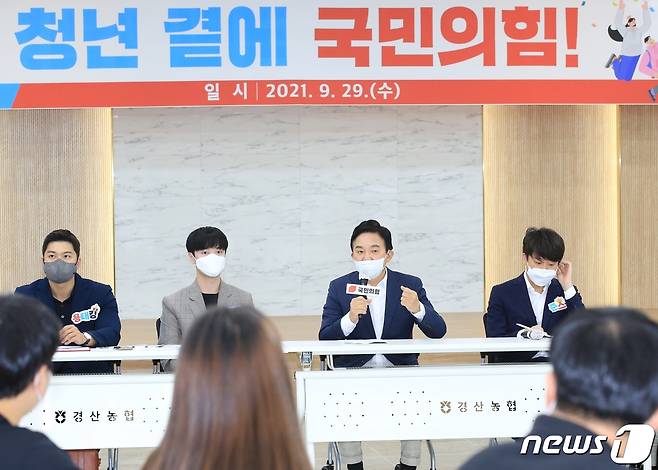 (경산=뉴스1) 공정식 기자 = 원희룡 국민의힘 대선 경선 예비후보가 29일 오후 경북 경산농협 본점에서 열린 '청년곁에 국민의힘, 영남캠퍼스 총회'에 참석해 발언하고 있다. (원희룡 캠프 제공) 2021.9.29/뉴스1
