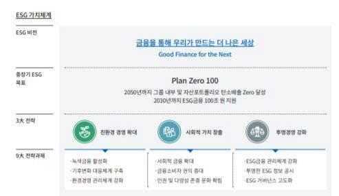 또 ESG금융을 통한 지속가능한 성장에 기여하기 위한 그룹 'ESG경영 원칙'을 제정해 ESG금융 정의와 목적을 명확하게 정했다.