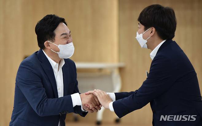 [경산=뉴시스] 이무열 기자 = 이준석 국민의힘 대표(오른쪽)가 29일 오후 경북 경산시 경산농협 본점 대회의실에서 열린 국민의힘 영남캠퍼스 총회에 참석해 원희룡 후보와 악수를 나누고 있다. 2021.09.29. lmy@newsis.com