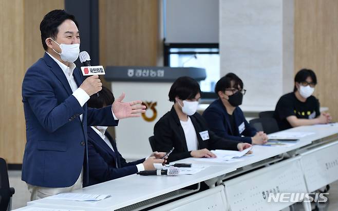 [경산=뉴시스] 이무열 기자 = 원희룡 국민의힘 대선 경선 후보가 29일 오후 경북 경산시 경산농협 본점 대회의실에서 열린 국민의힘 영남캠퍼스 총회에 참석해 인사말을 하고 있다. 2021.09.29. lmy@newsis.com