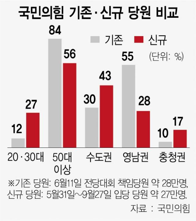 신규 당원은 국민의힘의 전통적인 당원과 달리 20·30대와 수도권·충청 비율이 높은 것이 특징이다.