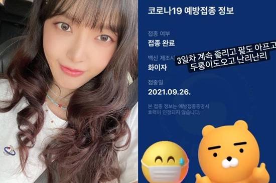 찬미는 "3일차, 계속 졸리고 팔도 아프고 두통이 오고 난리난리"라는 문구를 덧붙이며 후유증을 호소해 눈길을 끌었다.