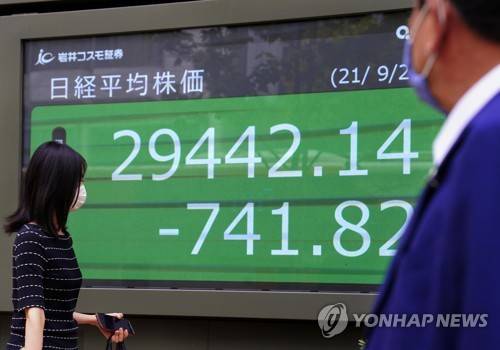 epa09494777 A pedestrian walks past a display showing the Nikkei Stock Average after a morning trade session in Tokyo, Japan, 29 September 2021. Tokyo's Nikkei Stock Average fell 639.67 points, or 2.12 percent, to close at 29,544.29 after Wall Street lost more than 569 points amid potential US debt default woes. EPA/KIMIMASA MAYAMA