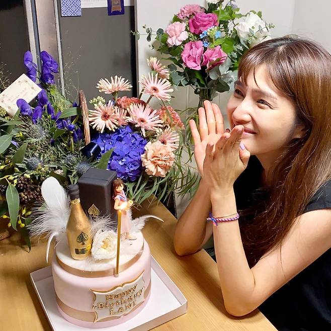 공개된 사진 속 김경란은 생일 케이크를 앞에 두고 활짝 웃는 모습이다. 꽃들 사이에서 빛나는 그의 미모가 시선을 사로잡는다.