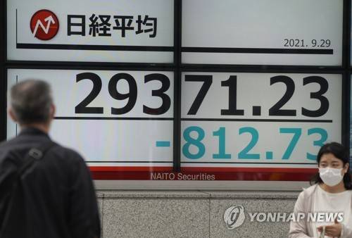 epa09494781 Pedestrians walk past a display showing the Nikkei Stock Average during an afternoon trade session in Tokyo, Japan, 29 September 2021. Tokyo's Nikkei Stock Average fell 639.67 points, or 2.12 percent, to close at 29,544.29 after Wall Street lost more than 569 points amid potential US debt default woes. EPA/KIMIMASA MAYAMA