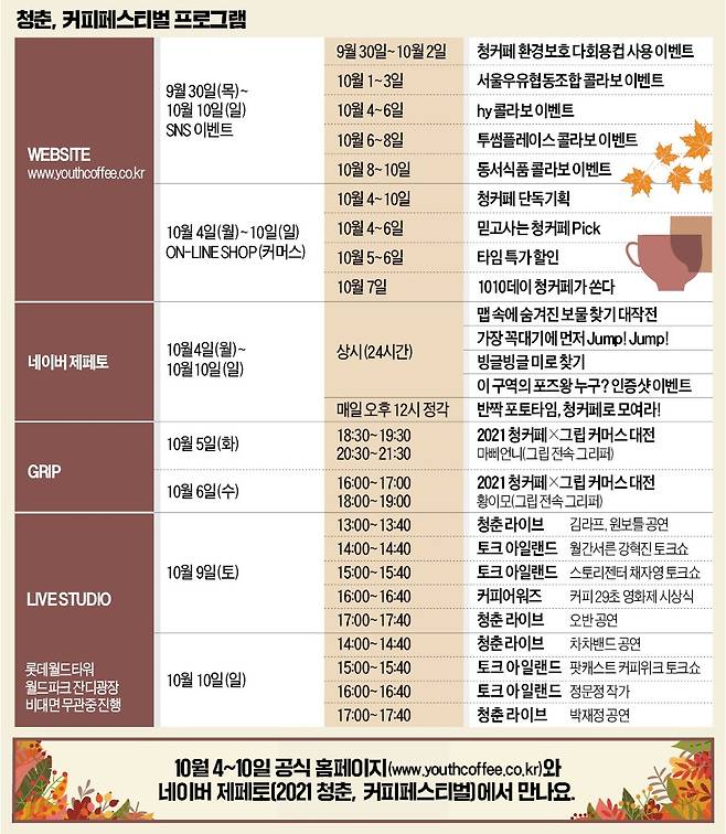 ‘청춘, 커피페스티벌’(청커페)은 송파구와 한국경제신문사가 주최하는 국내 최대 규모 커피문화 축제다. 2017년부터 매년 가을 서울 잠실 롯데월드타워 일대와 석촌호수 인근에서 열렸다. 올해는 코로나19 상황을 고려해 오프라인 공연과 메타버스 등 온·오프라인을 연계해 기획했다.
