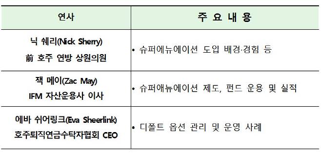 금번 웹세미나는 주한호주대사관 무역대표부와 공동으로 호주 퇴직연금 전문가들을 초청하여 개최할 예정이다. 호주 슈퍼에뉴에이션 도입 초기 담당 장관이었던 닉 쉐리(Nick Sherry) 전 호주 연방 상원의원을 직접 초대해 슈퍼에뉴에이션 도입 초기 시절에 대한 내용 등에 대해 들어볼 예정이다.