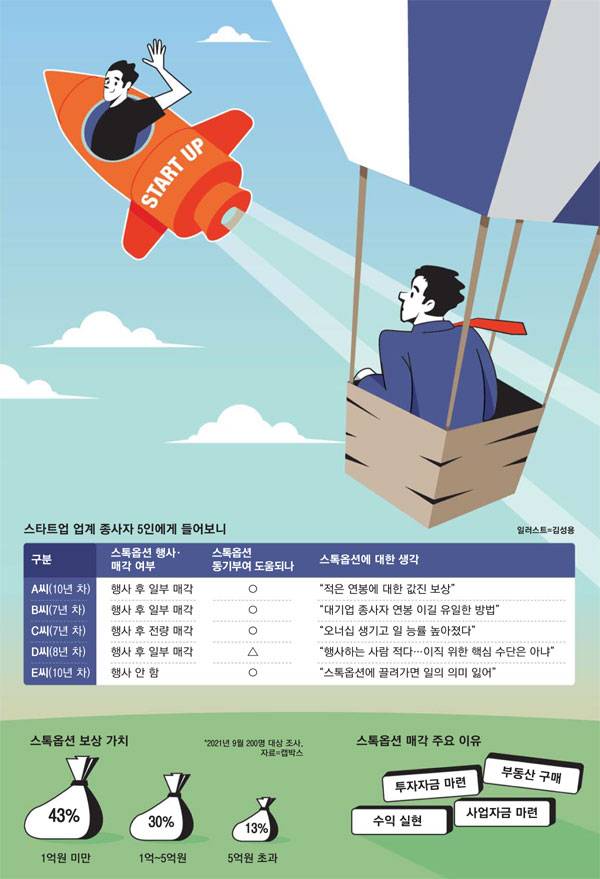 D씨도 "스타트업은 5~10년 길게 보고 가야 한다. 인수·합병이나 상장 같은 이벤트는 예상할 수 없기에 스톡옵션 매각은 정말로 어려운 일"이라며 "외적인 변수에 지나치게 매몰되면 루틴하게 일하는 자기 모습을 잃어버린다"고 강조했다.