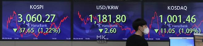 미국 증시 급락의 여파로 코스피가 전날보다 37.65포인트(1.22%) 내린 3,060.27에 마감한 29일 서울 중구 하나은행 딜링룸 전광판에 코스피 종가가 표시돼 있다.