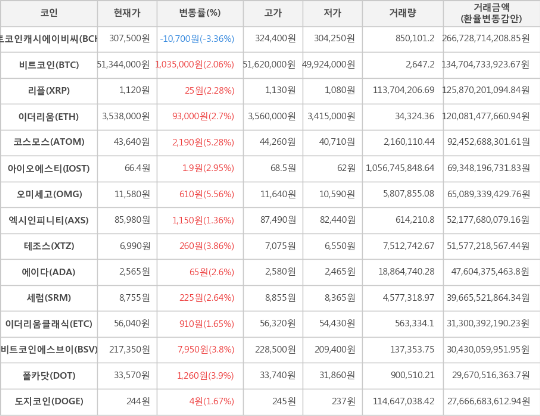 하락세를 보이는 가상화폐는 비트코인캐시에이비씨 1종목으로 전일 대비하여 현재 -3.36% 하락한 307,500원에 거래되고 있다.