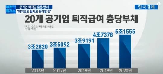 국회 기획재정위 소속 추경호 의원실(국민의힘) 자료에 따르면 20개 공기업의 지난 5년간 퇴직급여 충당부채는 매년 상승해 5조원을 넘어섰습니다.