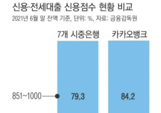 A look at the number of accounts as of the end of June 2021 also showed that clients with high credit scores accounted for 72.3% of the loans offered by the seven commercial banks, while at Kakao Bank they accounted for 85.6%. Borrowers with fair credit scores accounted for 19.9% of the loans at the commercial banks, but only 10% at Kakao Bank.