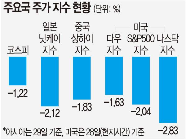 같은 날 중국 상하이지수(-1.83%), 일본 닛케이지수(-2.12%)도 큰 폭으로 하락하면서 아시아 주요국 증시는 줄줄이 ‘파란불’을 켰다.