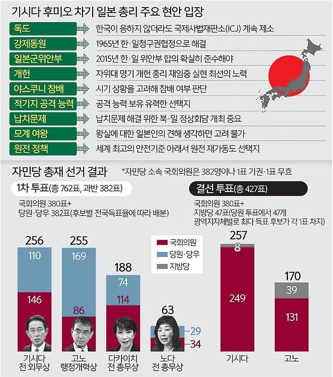 문제는 이번 자민당 총재 선거를 계기로 기시다 정권 출범에 결정적 역할을 한 아베 신조(安倍晋三) 전 총리를 중심으로 하는 우익 세력의 영향력이 더욱 확대될 것으로 보인다는 점이다. 아베 전 총리 출신의 제1파벌(소속 의원 96명)은 1차 투표에서 3위를 차지한 다카이치 사나에(高市早苗) 전 총무상 지지표를 결선 투표에서는 기시다 측으로 돌려 싱거운 낙승을 가져왔다. 아베 전 총리가 향후 기시다 정권에서 상왕 노릇을 할 가능성은 한·일 관계에 악재다.