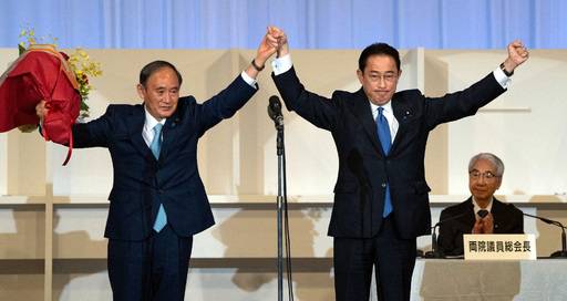 | 29일 일본 자민당 총재 선거에서 승리한 기시다 후미오 전 외무상(오른쪽)이 스가 요시히데 총리의 손을 잡고 지지자들에게 답례하고 있다. 도쿄=AFP연합뉴스 |