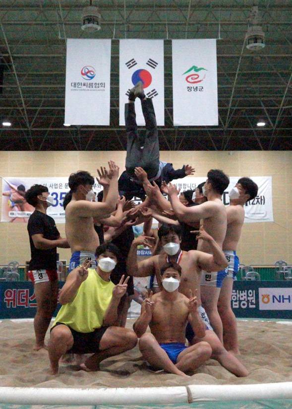 [서울=뉴시스] 추상철 기자 = 제35회 전국시도대항장사씨름대회(2차)가 열린 29일 경남 창녕군 창녕국민체육센터에서 대학교부 단체전 우승팀인 경기대학교 선수들이 기념촬영을 하고 있다. (사진= 대한씨름협회 제공) 2021.09.29. photo@newsis.com *재판매 및 DB 금지