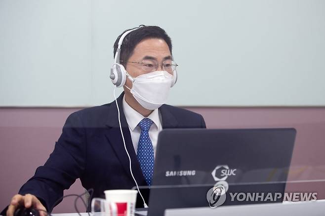(서울=연합뉴스) 용홍택 과학기술정보통신부 제1차관이 29일 오후 '누리호 발사관리위원회' 영상회의를 주재하고 있다. 2021.9.29