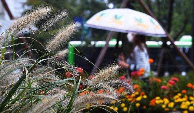 전국에 가을비가 내린 29일 서울 종로구 청계광장에서 한 시민이 활짝 핀 수크령 꽃밭을 지나고 있다. /오승현 기자