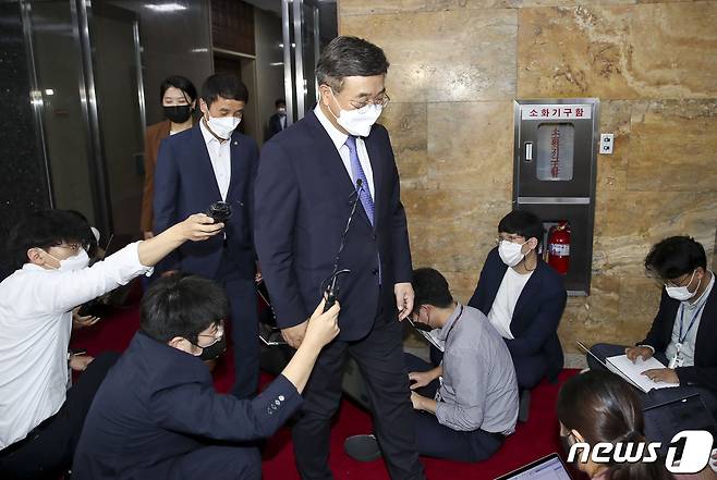 (서울=뉴스1) 구윤성 기자 = 윤호중 더불어민주당 원내대표가 29일 서울 여의도 국회에서 박병석 국회의장 주재로 열린 언론중재법 관련 여야 원내대표 회동을 마친 뒤 의장실을 나서고 있다. 2021.9.29/뉴스1