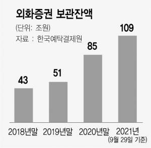29일 한국예탁결제원에 따르면 이날 기준 국내 투자자가 예탁원을 통해 보관 중인 해외 주식과 해외 채권 규모는 916억 달러(약 109조 원)로 집계됐다.