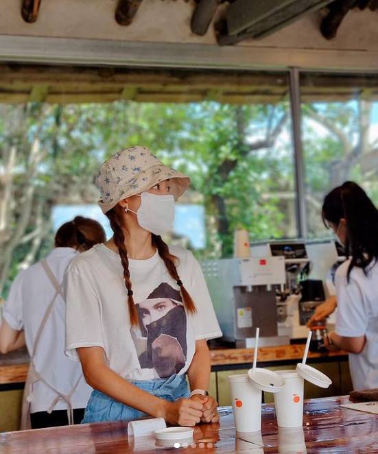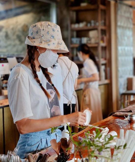 사진에는 박한별이 직접 손님에게 음료를 전달하려 테이블 앞에 서있는 모습이 담겼다. 작은 얼굴은 챙이 넓은 모자와 마스크에 가려졌으나 커다랗고 맑은 눈 등 가려지지 않는 미모가 이목을 집중시킨다. 특히 청바지에 티셔츠를 걸친 수수한 차림에도 박한별의 늘씬한 몸매가 돋보인다.