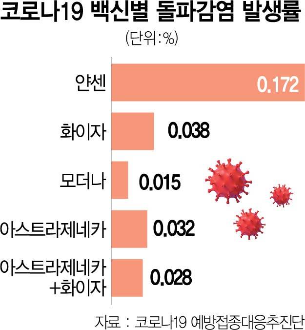 얀센 접종자의 돌파감염 발생률은 0.172%(10만 명당 171.5명)로 가장 높았다. 얀센 접종자의 돌파감염 발생률은 화이자(0.038%·10만 명당 37.9명)·아스트라제네카(0.032%·10만 명당 32.4명)의 5배, 모더나(0.015%·10만 명당 15.0명)의 11배에 달했다. 질병관리청은 얀센 백신 접종자의 돌파감염률이 상대적으로 높은 이유에 대해 “얀센 백신 접종 대상자의 활동력이 왕성해 코로나19 바이러스 노출 위험이 높아 돌파감염 위험도 높아지는 것으로 보고 있다”고 설명했다. 얀센 백신은 지난 6월부터 만 30세 이상 60세 미만 예비군과 민방위 대원, 군 관련 종사자를 대상으로 집중 접종이 이뤄졌다.