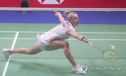 epa09494907 Mia Blichfeldt of Denmark in action against Putri Vardani of Indonesia during the 2021 Sudirman Cup in Vantaa, Finland, 29 September 2021. EPA/MAURI RATILAINEN