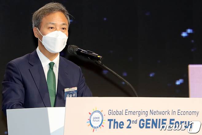 (전주=뉴스1) 유경석 기자 = 김승수 전주시장이 29일 전북 전주시 라한호텔에서 열린 제2회 지니포럼 개막식에서 환영사를 하고 있다. 2021.9.29/뉴스1