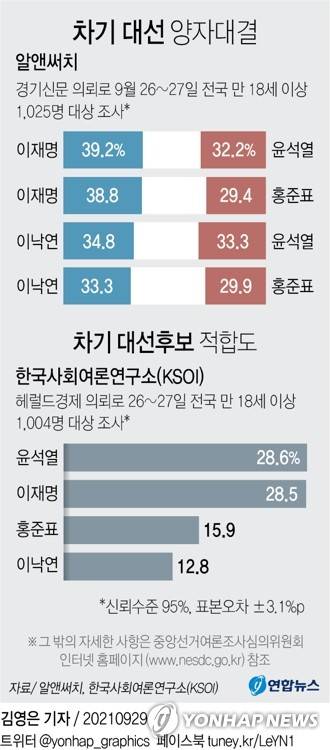 (서울=연합뉴스) 김영은 기자 = 알앤써치가 경기신문 의뢰로 지난 26~27일 전국 만 18세 이상 1천25명을 대상으로 '차기 대선 가상 양자 대결 지지도'를 조사한 결과, 이재명 경기지사는 39.2%의 지지를 받아 32.2%를 얻은 윤석열 전 검찰총장을 제쳤다.
