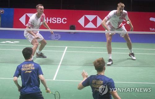 epa09494910 Mads Kolding and Frederik Sogaard of Denmark (back) in action against Marcus Gideon and Kev Sukamuljo of Indonesia during the 2021 Sudirman Cup Men Doubles badminton match in Vantaa, Finland, 29 September 2021. EPA/MAURI RATILAINEN