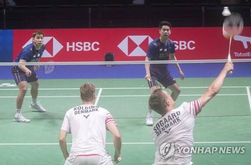 epa09494912 Marcus Gideon and Kev Sukamuljo of Indonesia (back) in action against Mads Kolding and Frederik Sogaard of Denmark during the 2021 Sudirman Cup Men Doubles badminton match in Vantaa, Finland, 29 September 2021. EPA/MAURI RATILAINEN