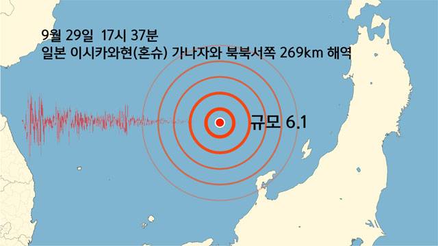 오늘(29일) 오후 5시 37분에 일본 이시카와현 가나자와 북북서쪽 269km 해역에서 규모 6.1의 지진이 발생했습니다.